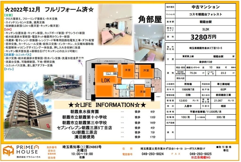 【本日ご案内いたします!】物件完成しております♪内覧可能です!ぜひお気軽にお問い合わせください♪さらにローンでお困りの方、是非『住宅ローンに強いプライムハウス』へご相談ください! ◆完全リフォーム済のため、室内大変綺麗です♪ ◆東武東上線「朝霞...