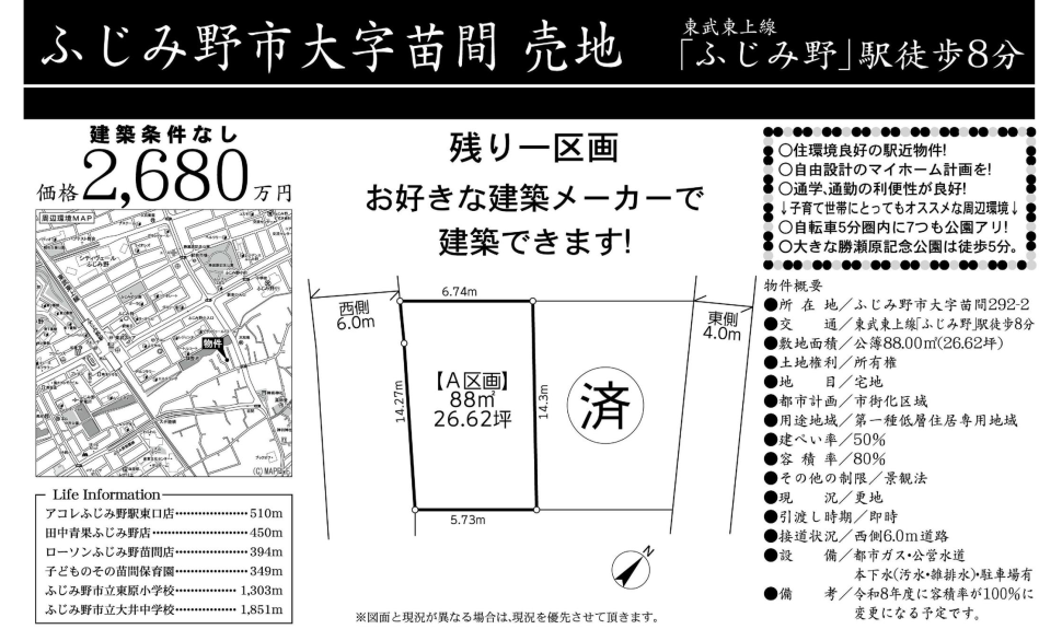 【3/5 価格大幅値下げ♪】ふじみ野市大字苗間🦩残り1区画🦩☆住環境良好の駅近物件!建築条件なし♪